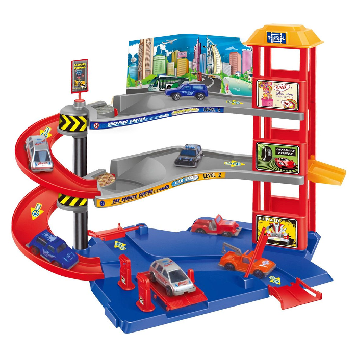 Великолепный подарок для мальчиков от 1 года до 5 лет. Парковочные места расположены на верхнем ярусе, а к нему ведут 2 спиралевидные дороги со страховочными бортиками. Во время движения малыш будет обращать внимание на людей, препятствия и дорожные знаки.
