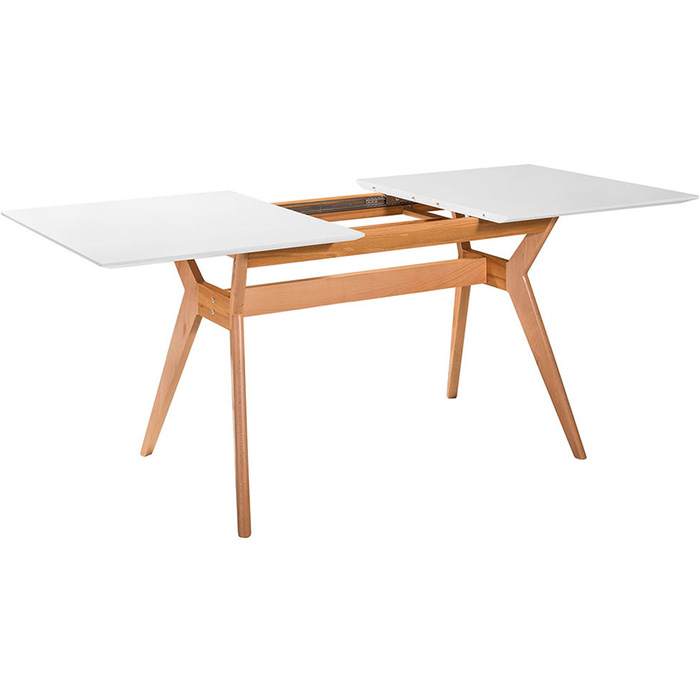 Прямоугольная форма визуально делает интерьер более уютным. Стол особенно подойдет под современные стили контемпорари и хай-тек. Опоры из натурального дерева хорошо сочетаются со светлыми поверхностями и каменным рисунком на ламинате или плитке.