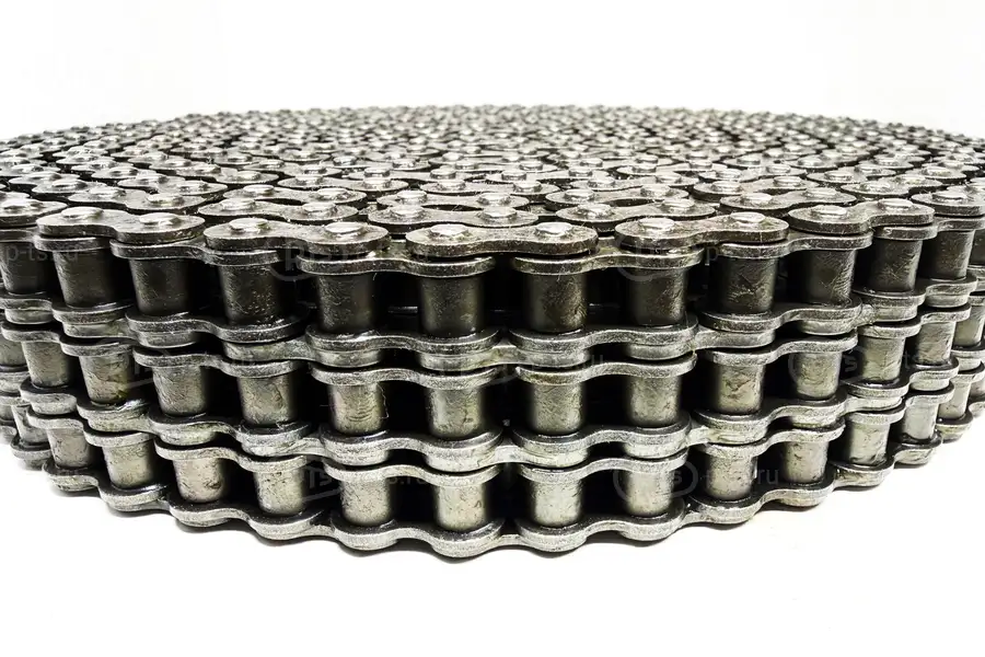 Приводная роликовая трёхрядная цепь 08В-3 ISO 606 (DIN 8187) производится из прочной стали в соответствии со стандартом, используется как деталь привода двигателя сельскохозяйственной техники, складского оборудования и электропривода большегрузных эскалаторов для передачи крутящего момента от одного вала к другому.
