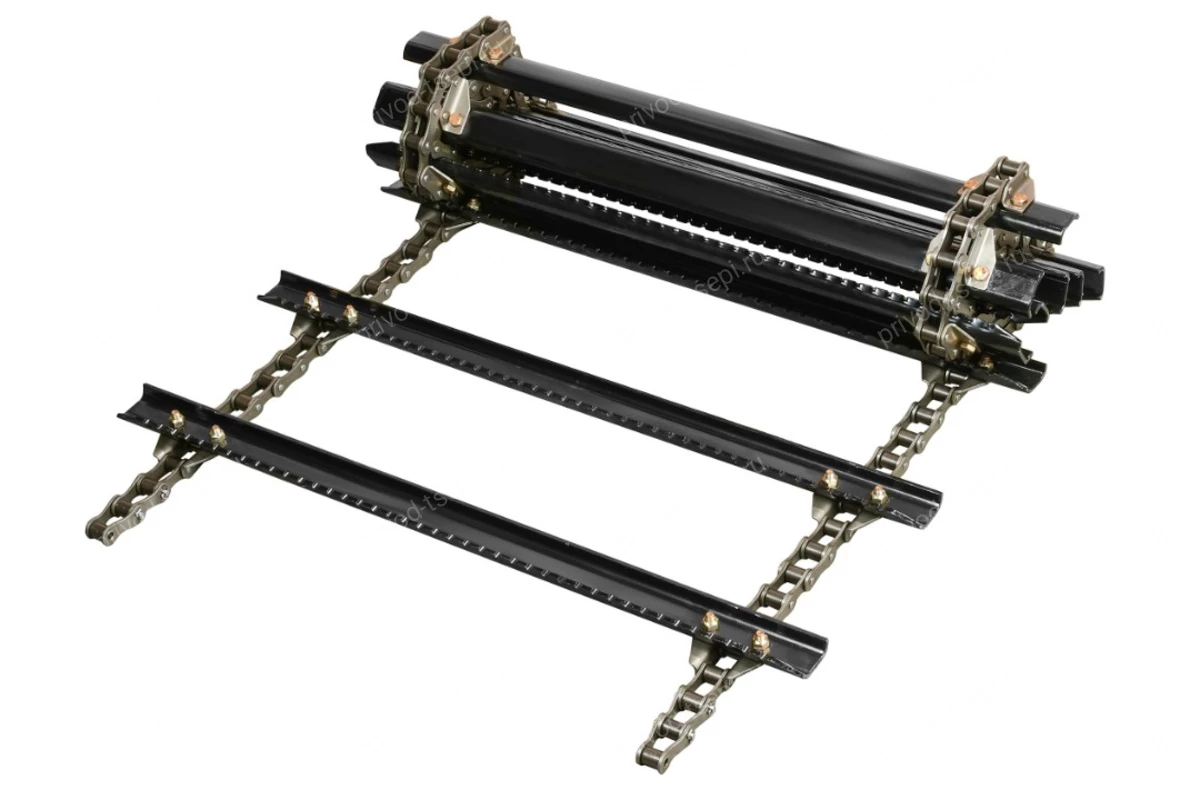 Усиленные планки транспортера обеспечивают сохранение геометрии при попадании в наклонную камеру инородных тел, а антикоррозионное покрытие позволяет избежать преждевременной порчи при хранении. Соединение планок с цепями производится высокопрочными метизами.