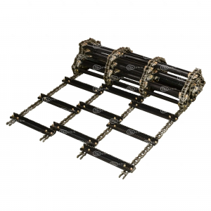 Усиленные планки транспортера обеспечивают сохранение геометрии при попадании в наклонную камеру инородных тел, а антикоррозионное покрытие позволяет избежать преждевременной порчи при хранении. Соединение планок с цепями производится высокопрочными метизами.