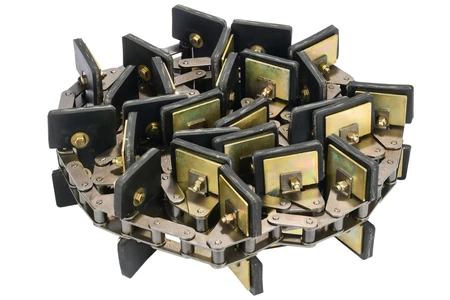 Усиленные планки транспортера обеспечивают сохранение геометрии при попадании в наклонную камеру инородных тел, а антикоррозионное покрытие позволяет избежать преждевременной порчи при хранении. Соединение планок с цепями производится высокопрочными метизами.