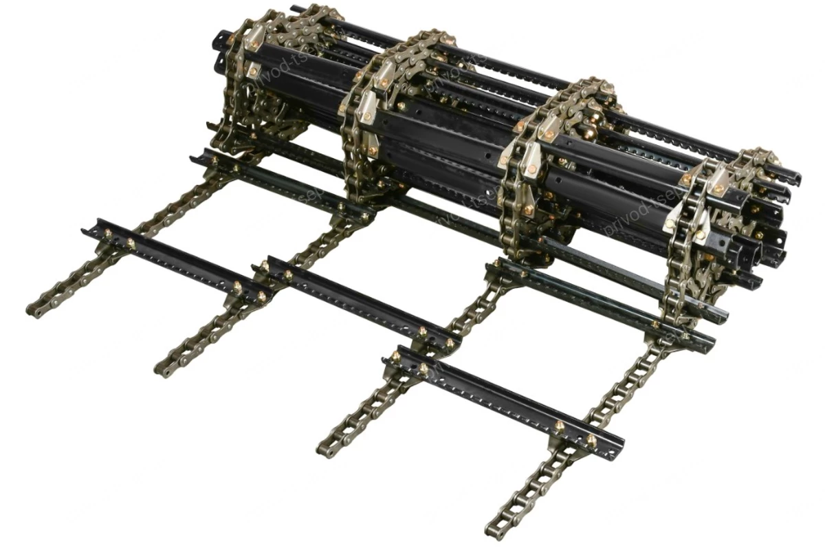 Усиленные планки транспортера обеспечивают сохранение геометрии при попадании в наклонную камеру инородных тел, а антикоррозионное покрытие позволяет избежать преждевременной порчи при хранении. Соединение планок с цепями производится высокопрочными метизами.