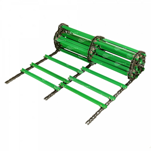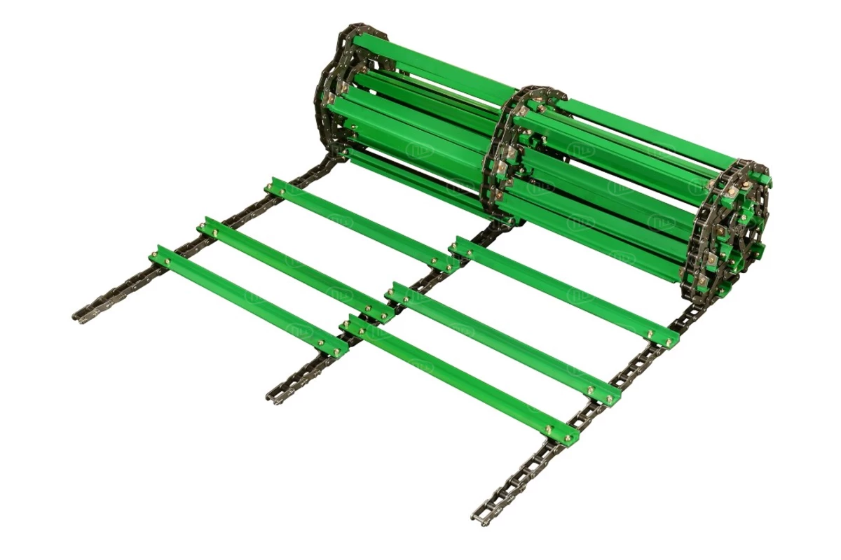 Усиленные планки транспортера обеспечивают сохранение геометрии при попадании в наклонную камеру инородных тел, а антикоррозионное покрытие позволяет избежать преждевременной порчи при хранении. Соединение планок с цепями производится высокопрочными метизами.