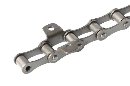 Промышленная длиннозвенная конвейерная роликовая цепь 2040-K1 с прикреплениями (аттачментами) изготовлена в соответствии со стандартом ANSI B29.1 и имеет симметричные двухсторонние горизонтальные крепления с одним отверстием на наружных звеньях. Используются в логистике (подвесные конвейеры для коробок, поддонов) и металлургии (транспортировка листового металла). Двусторонняя поддержка идеальна для монтажа широких платформ или крюков, где требуется равномерное распределение нагрузки.