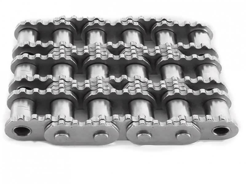 Роликовая цепь с зубчатыми пластинами 120-3-1802 производится на базе обычной трёхрядной приводной цепи 120-3 с ровным профилем пластин, но её основным отличием является наличие специальных зубчиков на пластинах. Такие зазубрины находятся на каждом звене, что улучшает контакт цепи с транспортируемым материалом и при этом не повреждает его.